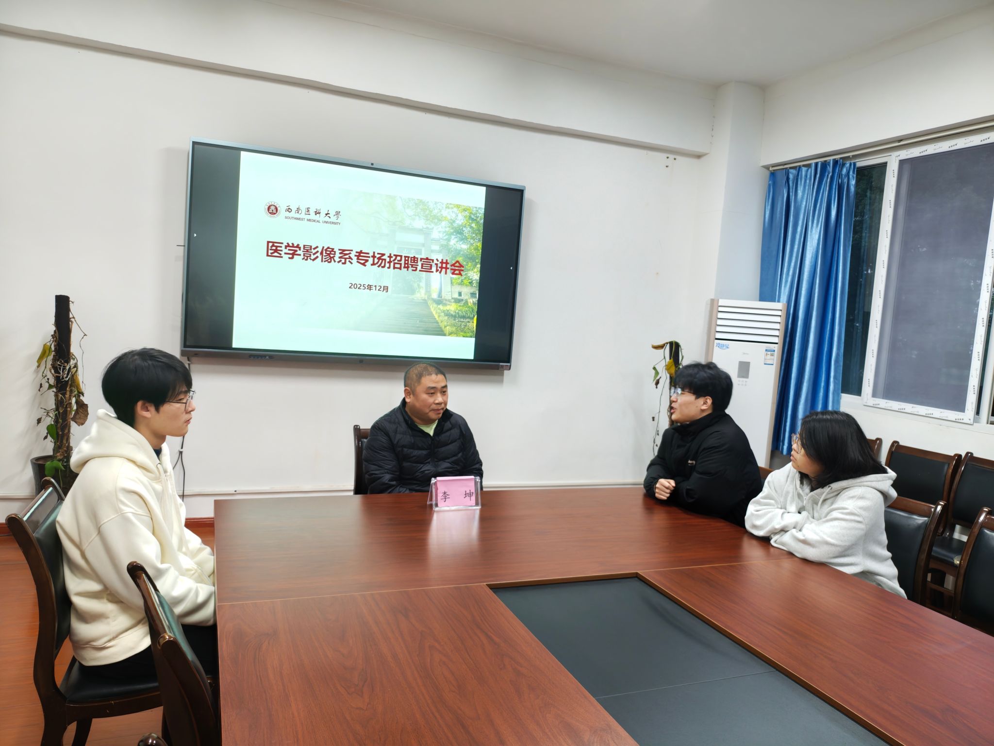 为促进医学影像人才精准对接,搭建优质就业平台,精准开拓就业岗位资源,12月9日,医学影像系于忠山校区含光楼304室开展“医职为你,启航未来”毕业生专场招聘宣讲会。纳溪区人民医院医学影像科主任李坤、医学影像系党总支书记刘秀、系主任舒健、学生科辅导员及2026届毕业生代表共同参会。