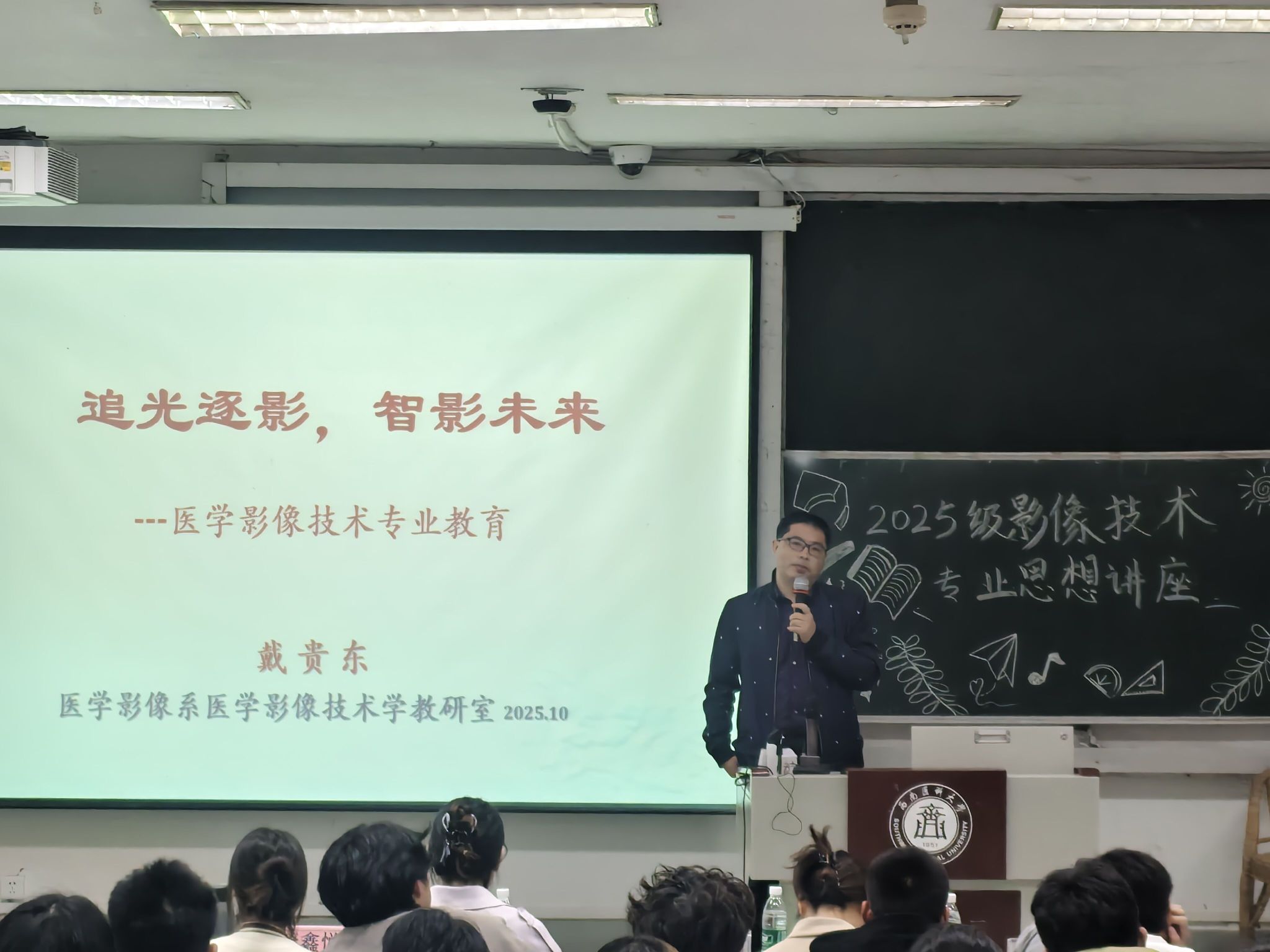近日,医学影像系在鸿文楼103教室召开了医学影像技术专业思想讲座。讲座由医学影像技术专业负责人戴贵东主讲,学生科副科长黄敏、辅导员苏建华、兼职班主任漆万银与张光莲、附院放射科技师陈澜菁与唐鑫悦以及2025级医学影像技术新生共同参与。